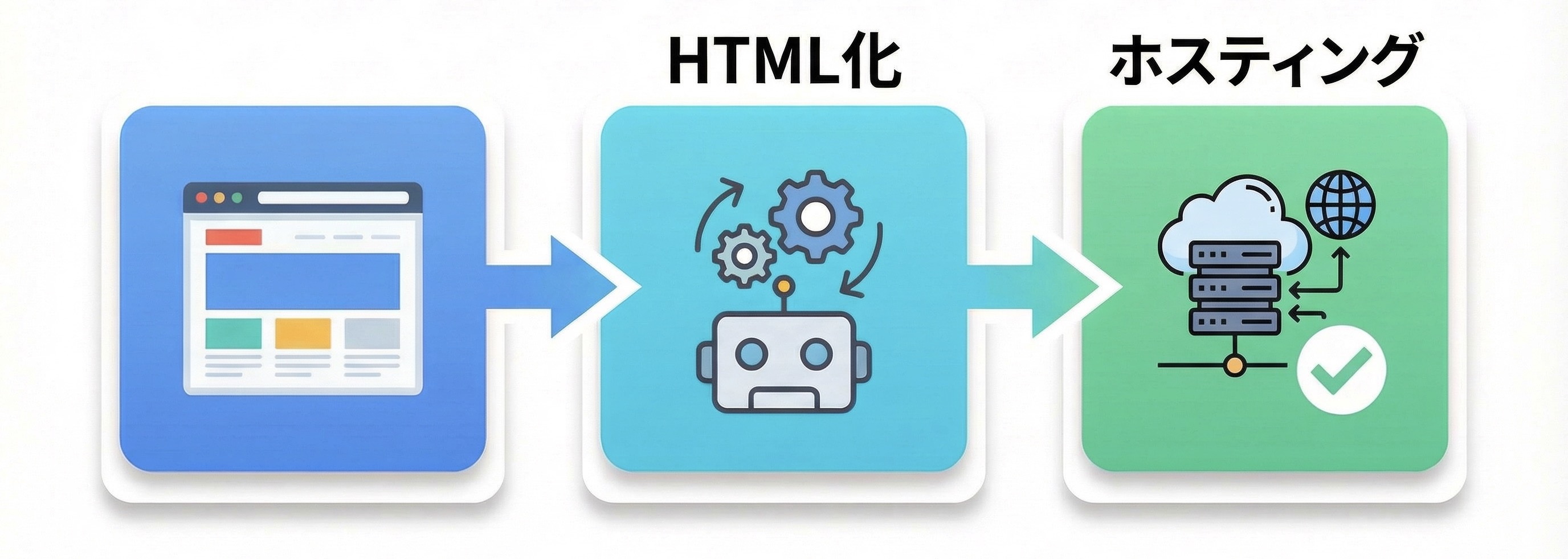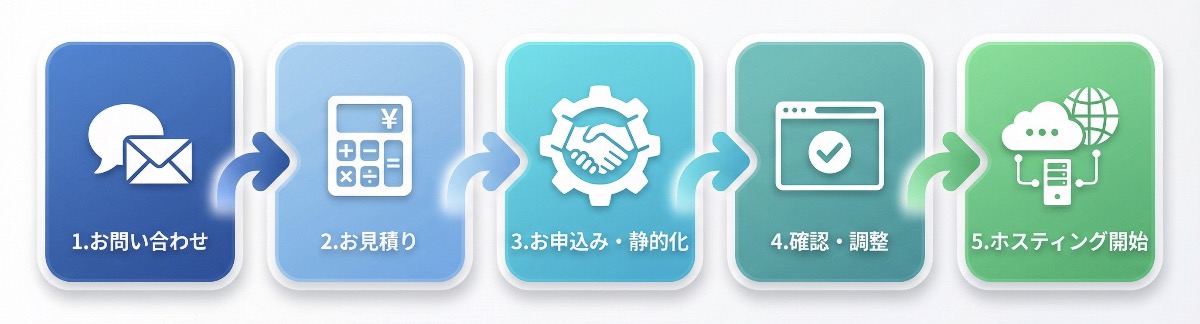 - お申込み・静的化実行: 正式にお申込み頂いた後、静的化を実行します
